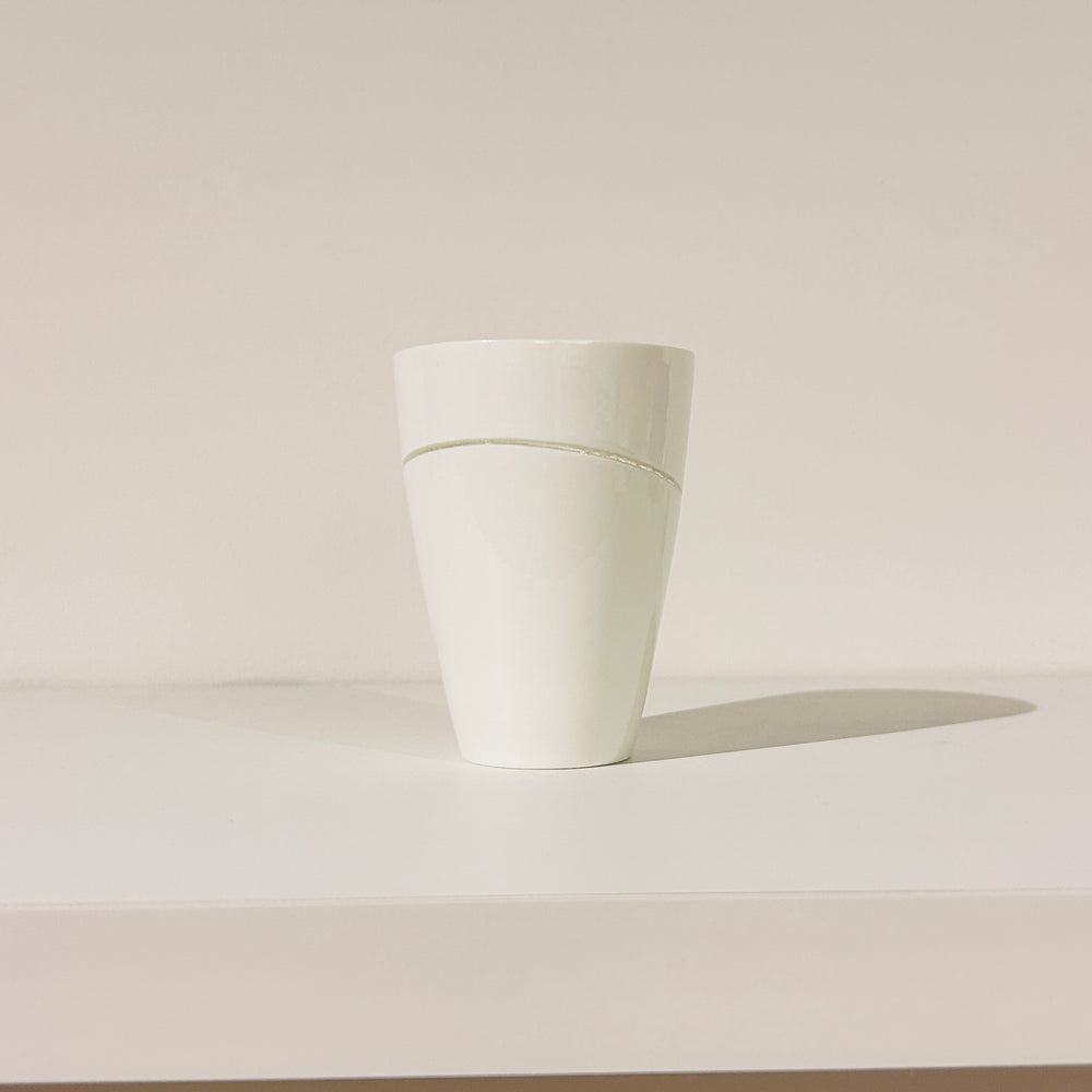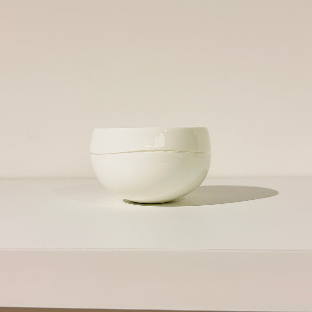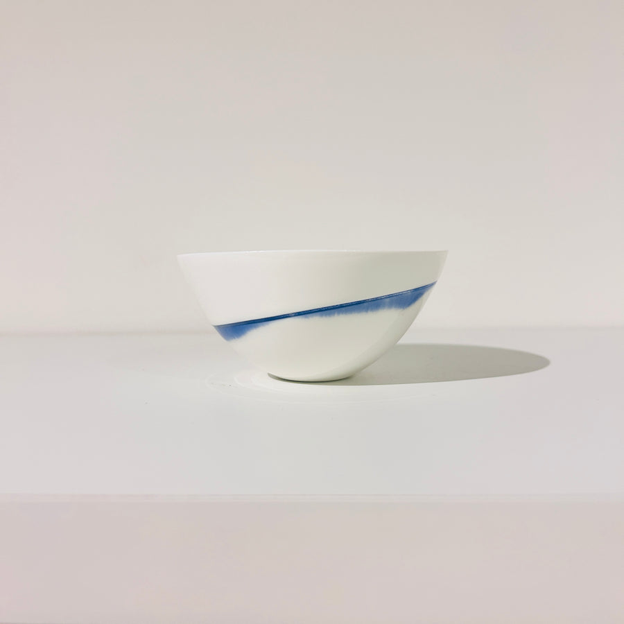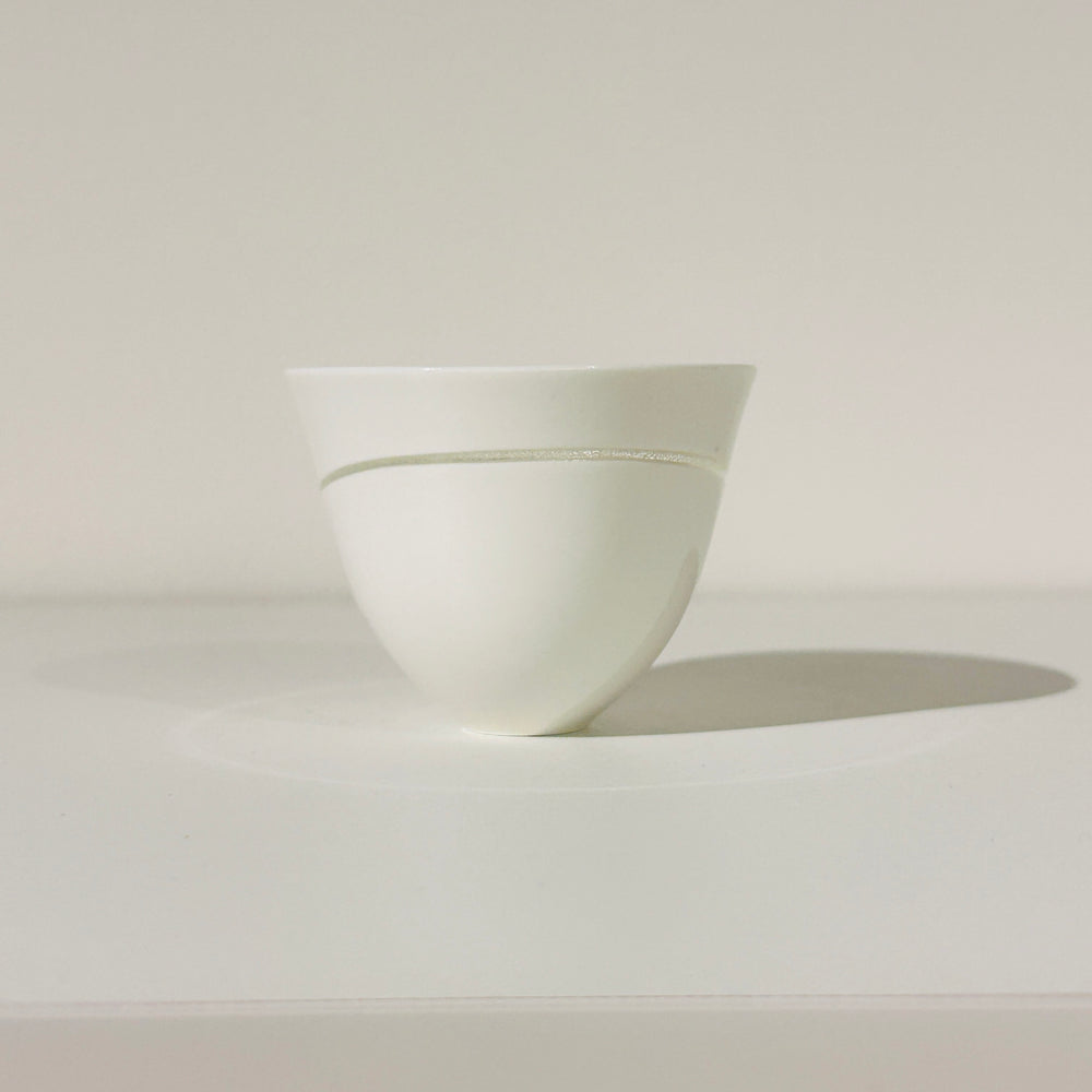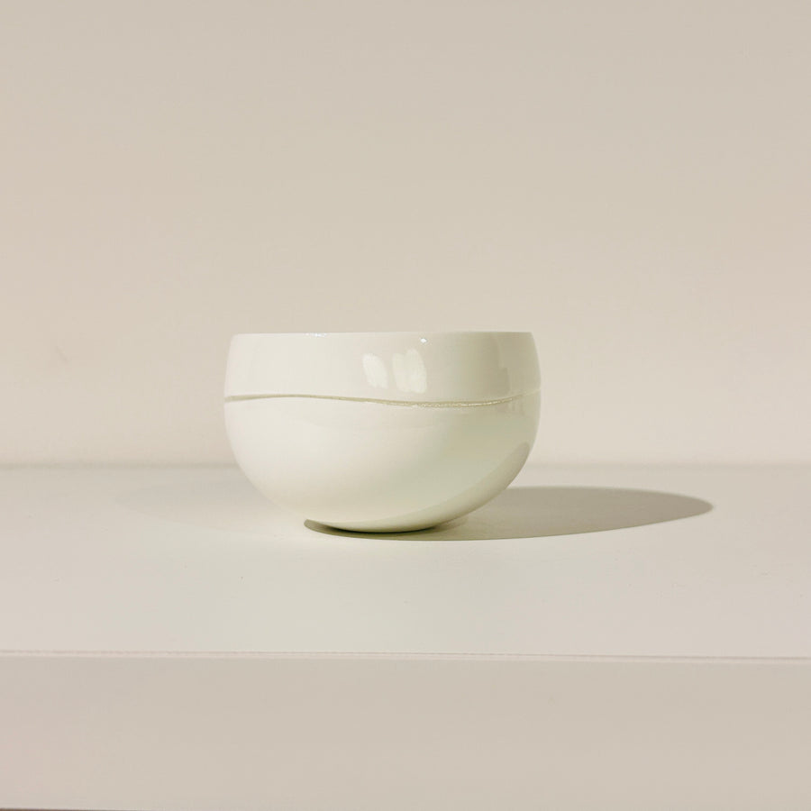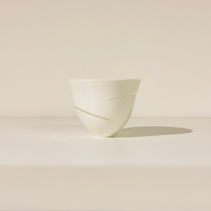 代表作である「光の線」シリーズ。「蛍手」という技法に着目し、釉薬が単なる装飾にとどまらず、土の役割までも担う点に魅力を感じ、独自に発展させたのが「線蛍」という技法。これは、素地を切り離し、その隙間を釉薬の線でつなぎ焼成することで、釉薬が作品の構造そのものを形づくるという新しい表現です。磁器とガラスの融合を成した素晴らしい作品です。