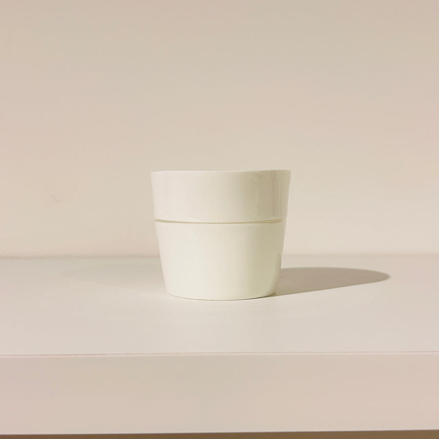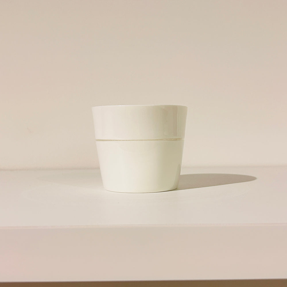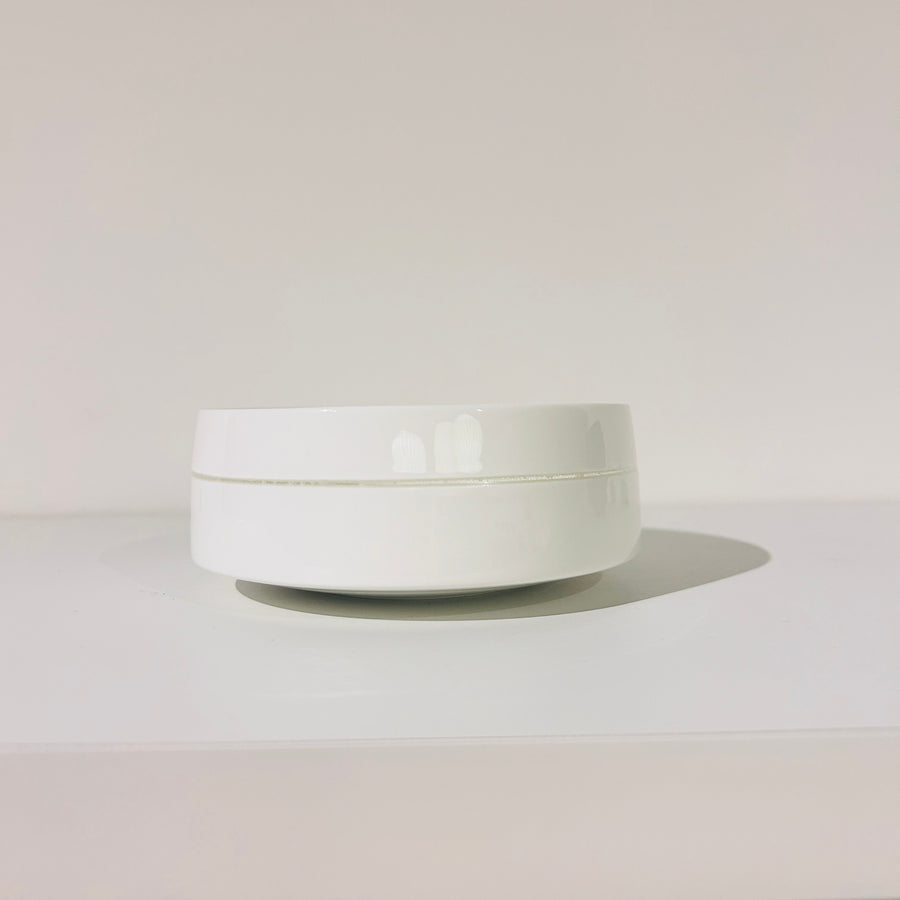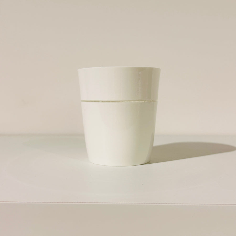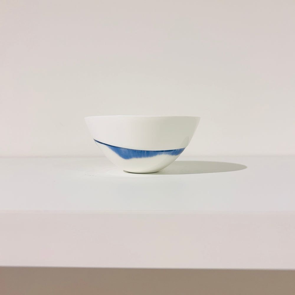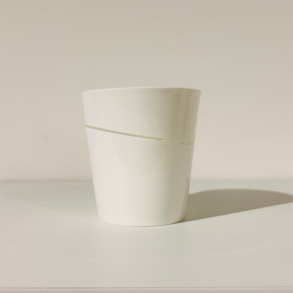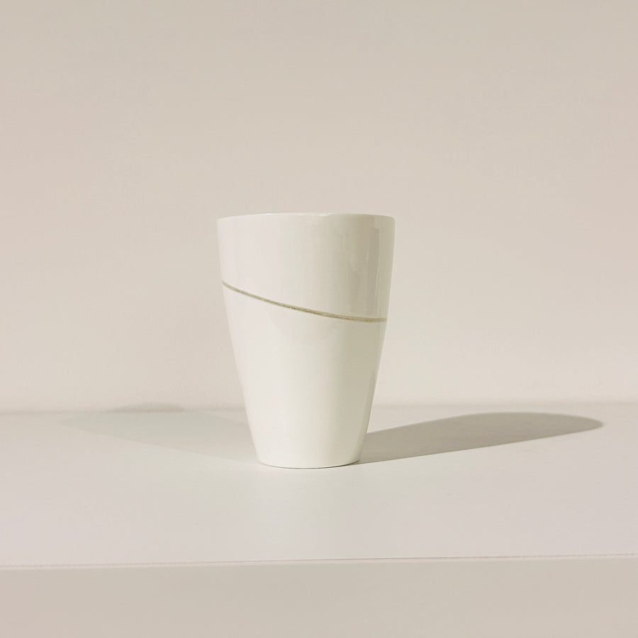 代表作である「光の線」シリーズ。「蛍手」という技法に着目し、釉薬が単なる装飾にとどまらず、土の役割までも担う点に魅力を感じ、独自に発展させたのが「線蛍」という技法。これは、素地を切り離し、その隙間を釉薬の線でつなぎ焼成することで、釉薬が作品の構造そのものを形づくるという新しい表現です。磁器とガラスの融合を成した素晴らしい作品です。