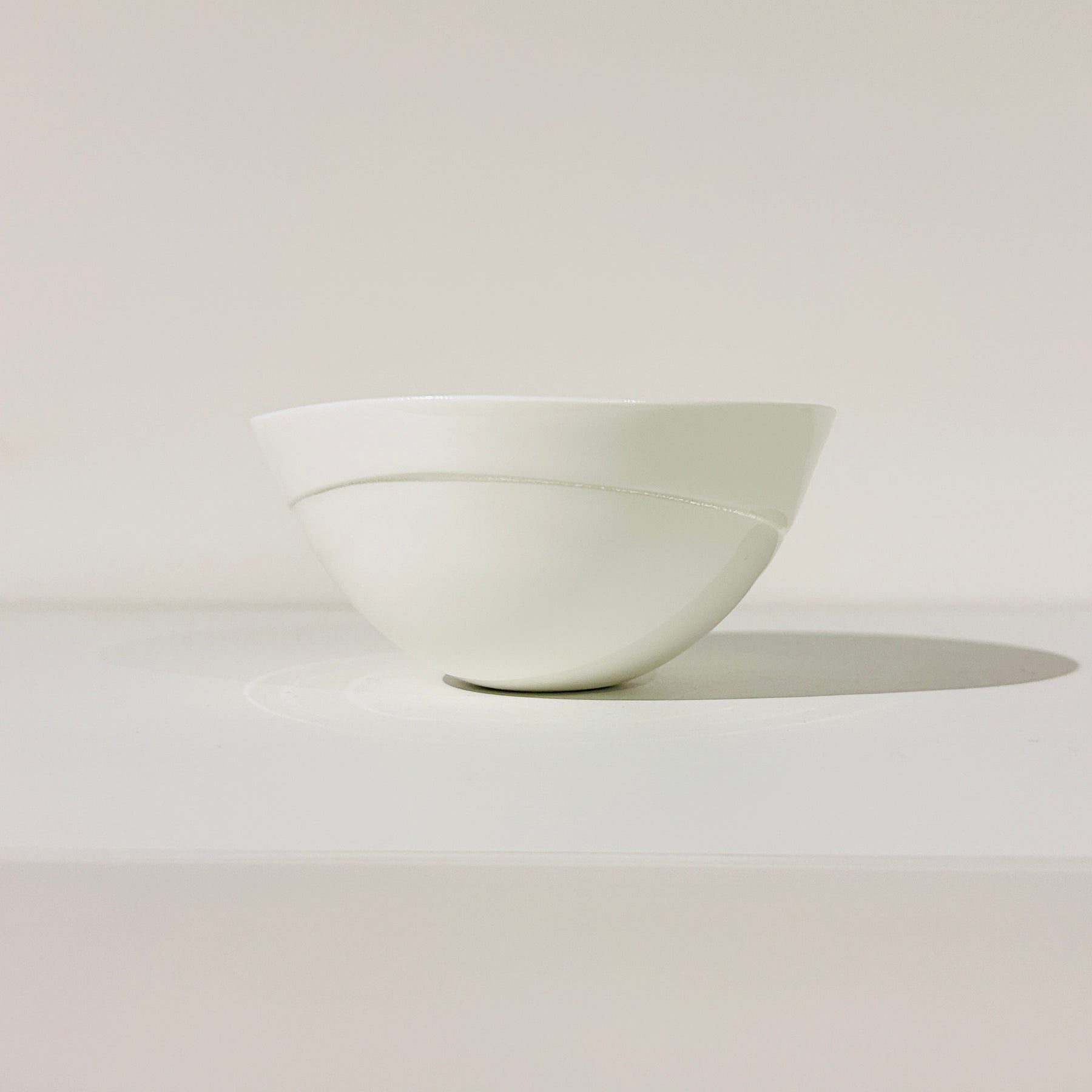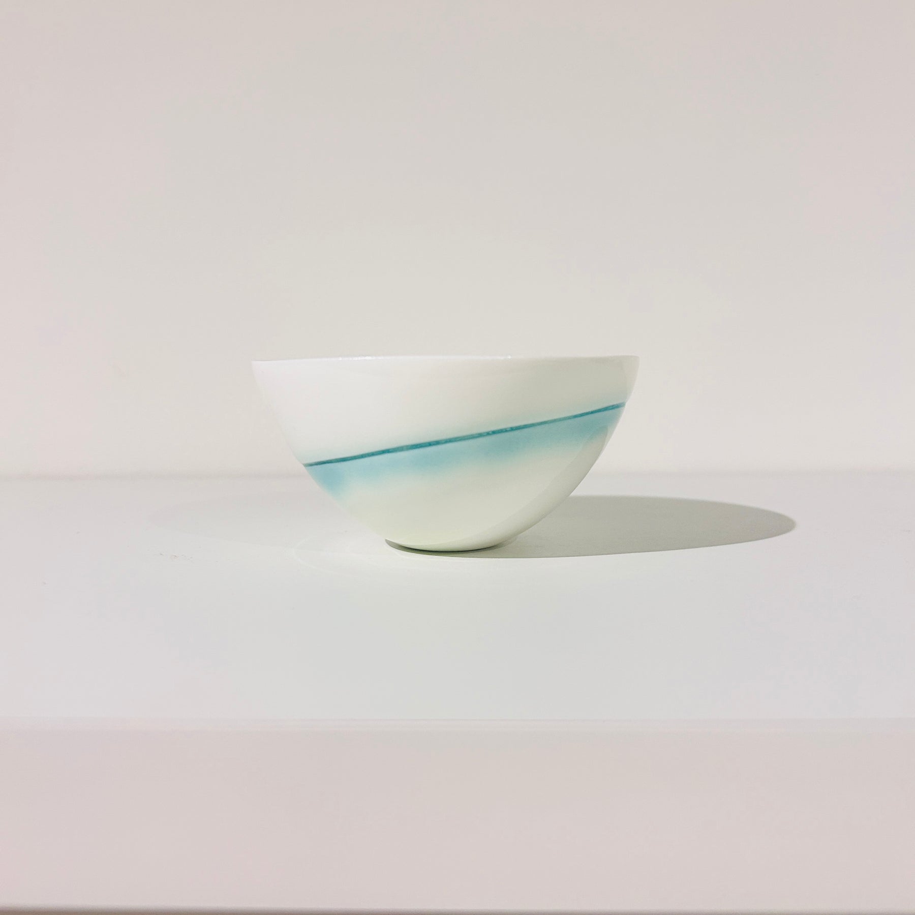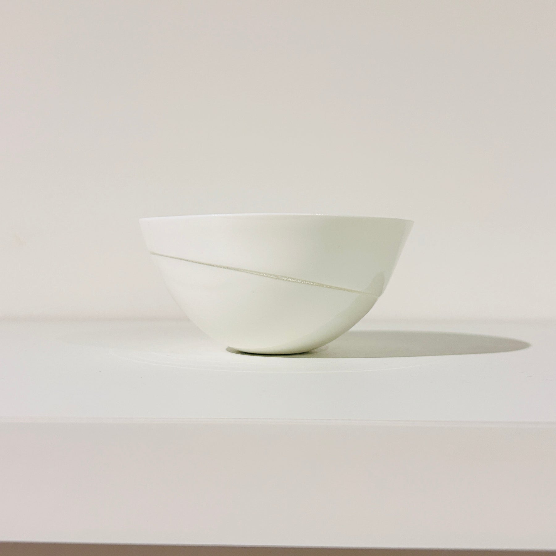 「蛍手」という技法に着目し、釉薬が単なる装飾にとどまらず、土の役割までも担う点に魅力を感じ、独自に発展させたのが「線蛍」という技法。これは、素地を切り離し、その隙間を釉薬の線でつなぎ焼成することで、釉薬が作品の構造そのものを形づくるという新しい表現です。磁器とガラスの融合を成した素晴らしい作品です。