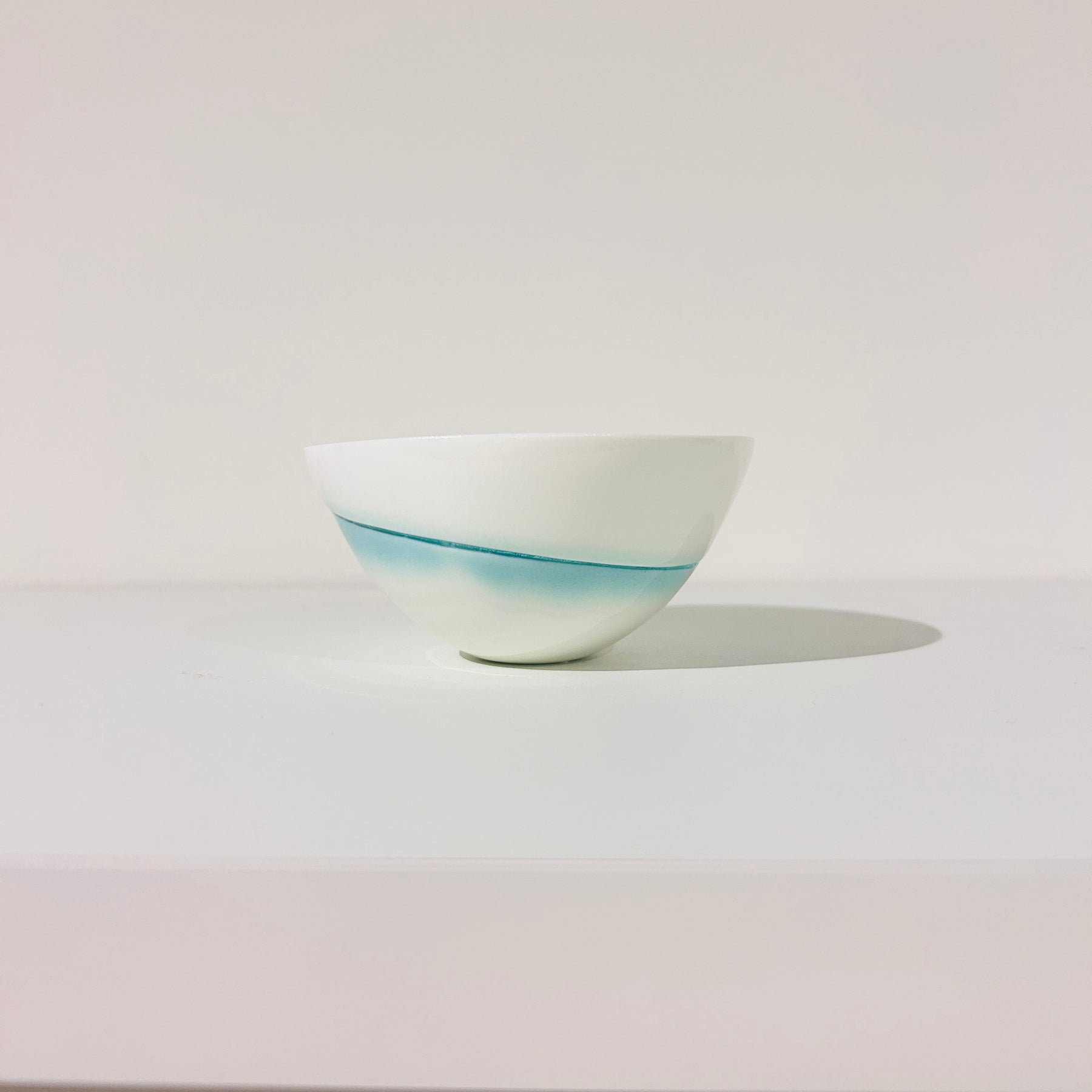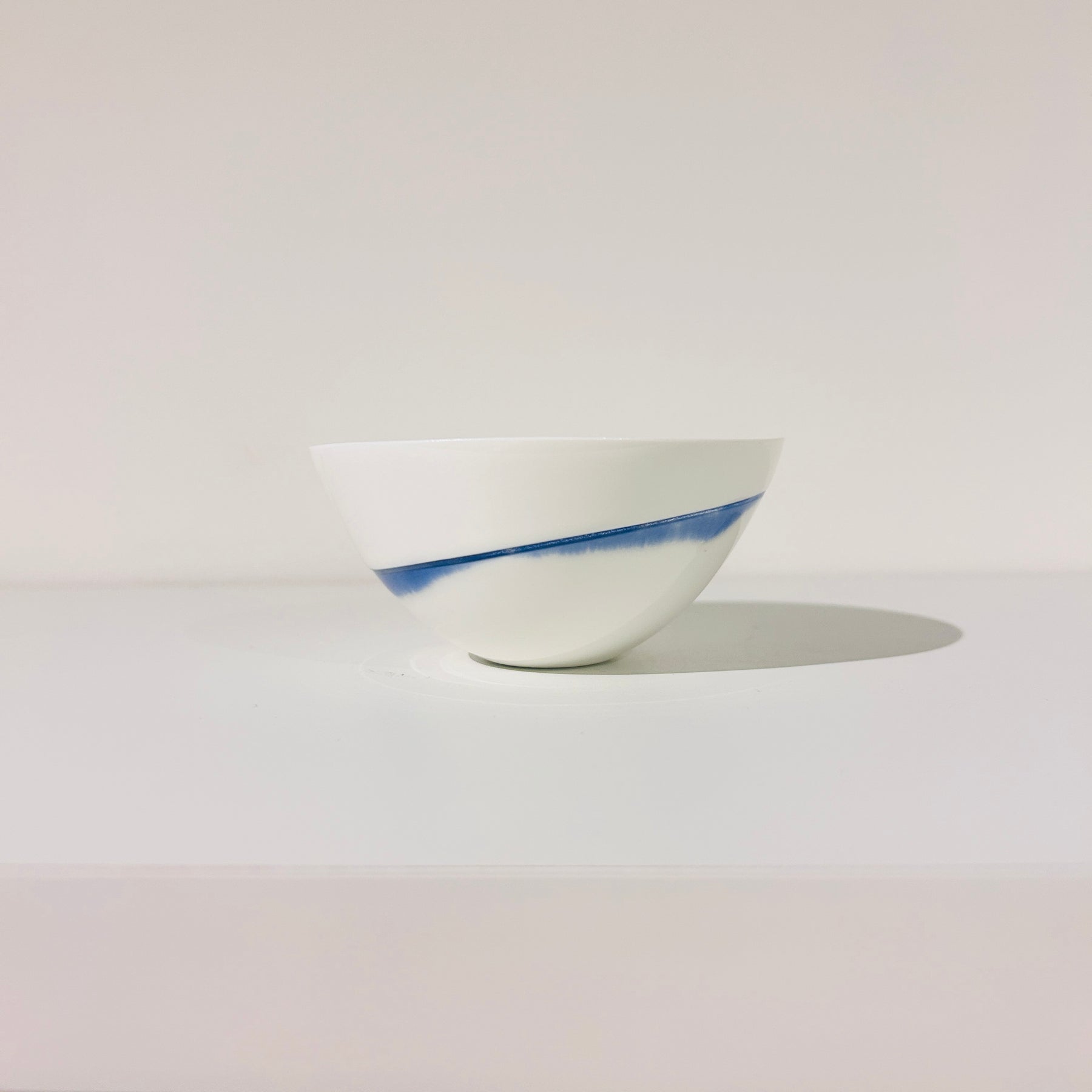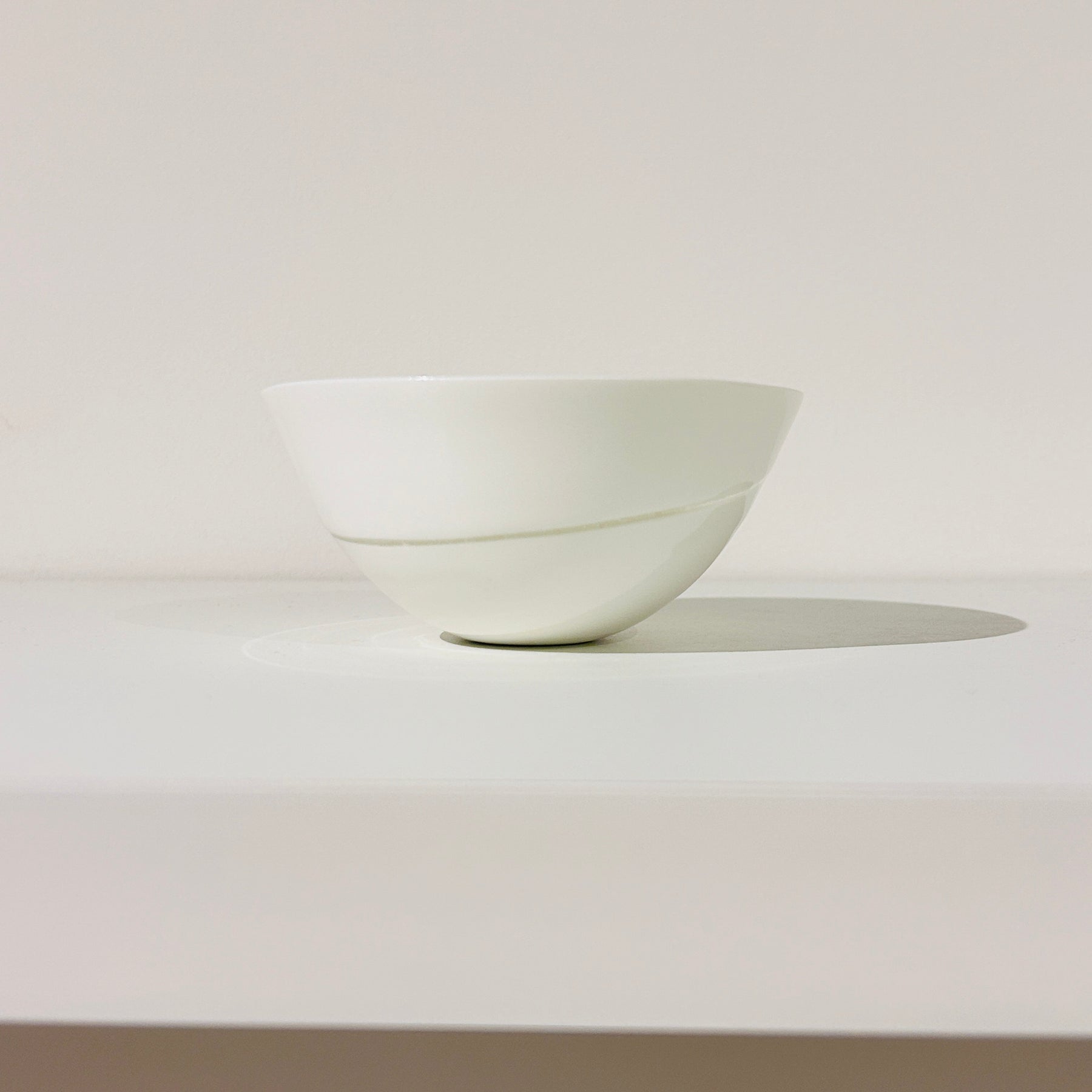 「蛍手」という技法に着目し、釉薬が単なる装飾にとどまらず、土の役割までも担う点に魅力を感じ、独自に発展させたのが「線蛍」という技法。これは、素地を切り離し、その隙間を釉薬の線でつなぎ焼成することで、釉薬が作品の構造そのものを形づくるという新しい表現です。磁器とガラスの融合を成した素晴らしい作品です。