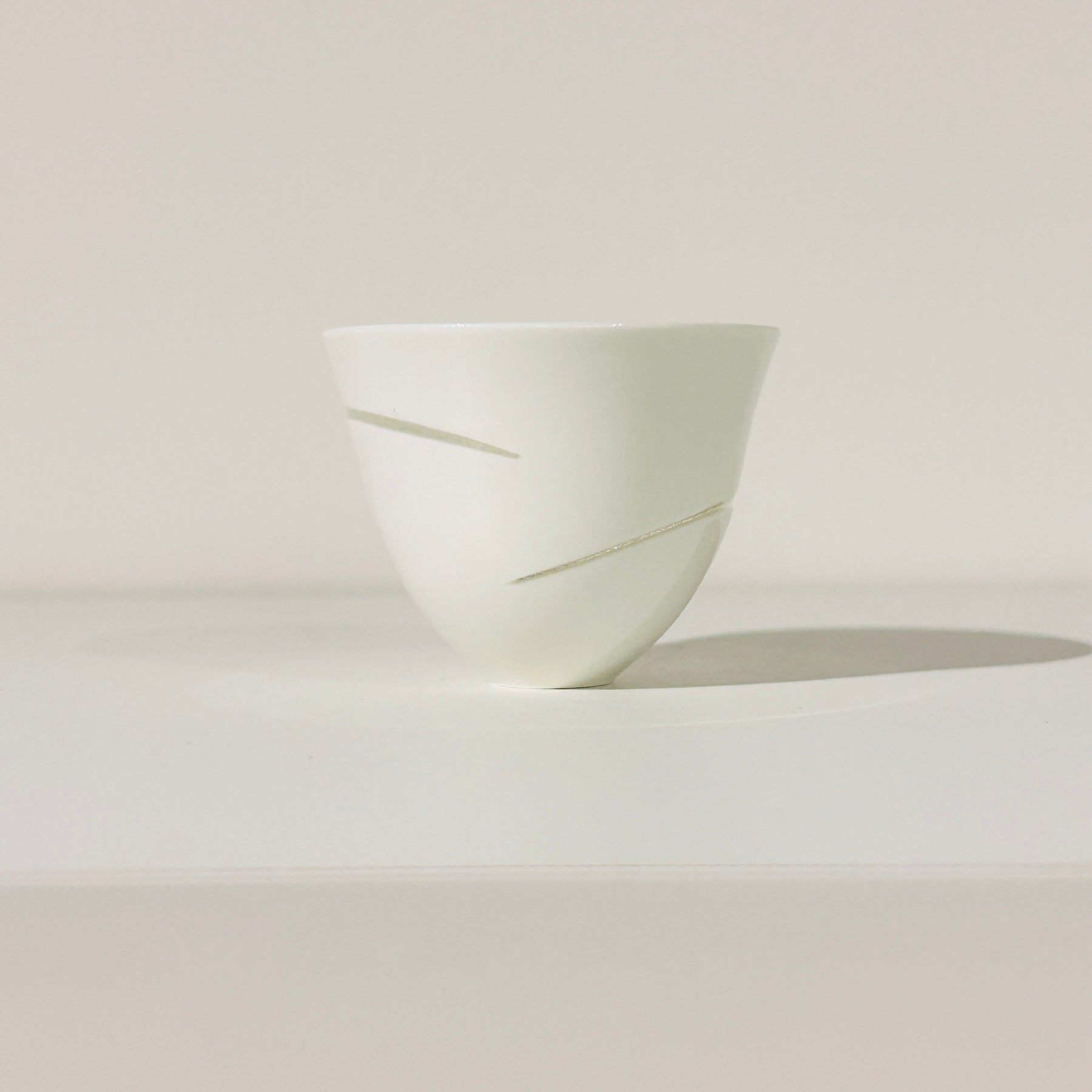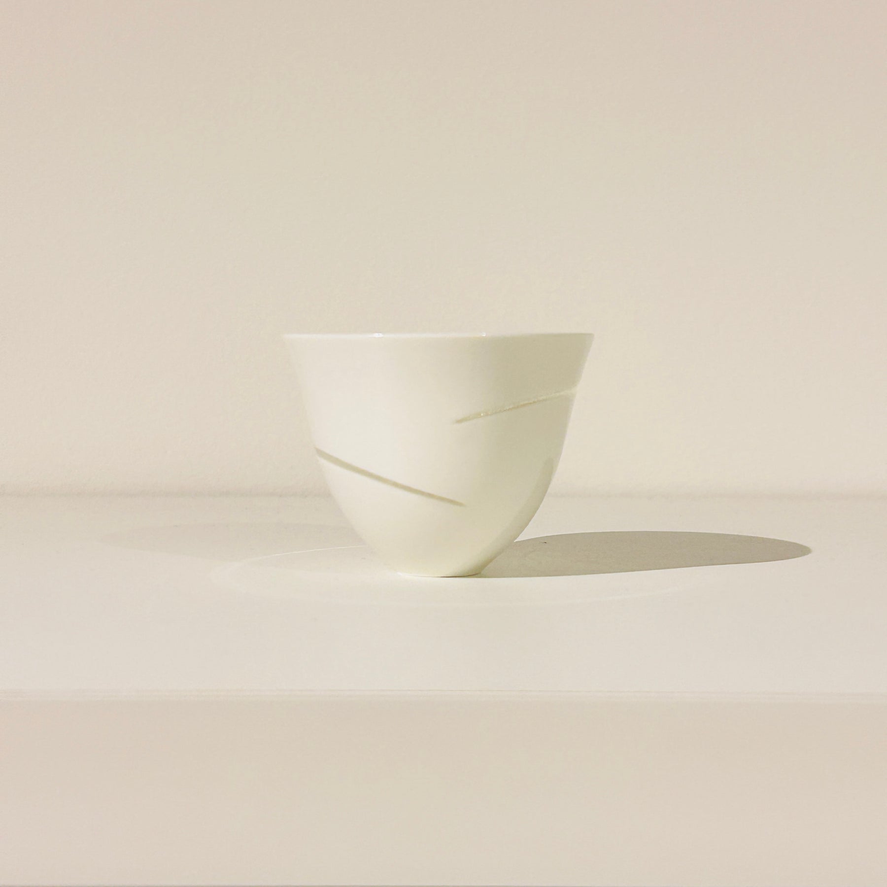 「蛍手」という技法に着目し、釉薬が単なる装飾にとどまらず、土の役割までも担う点に魅力を感じ、独自に発展させたのが「線蛍」という技法。これは、素地を切り離し、その隙間を釉薬の線でつなぎ焼成することで、釉薬が作品の構造そのものを形づくるという新しい表現です。磁器とガラスの融合を成した素晴らしい作品です。