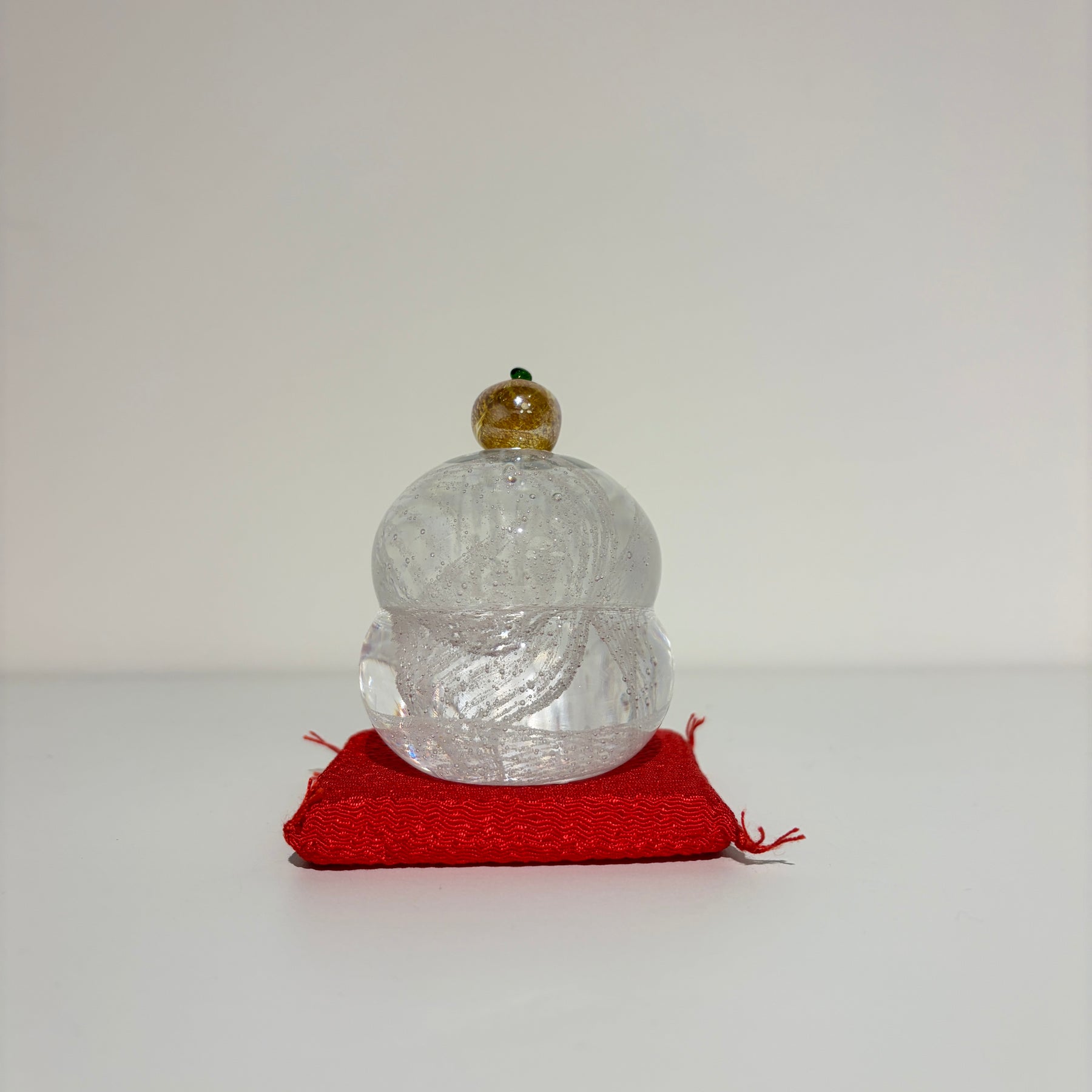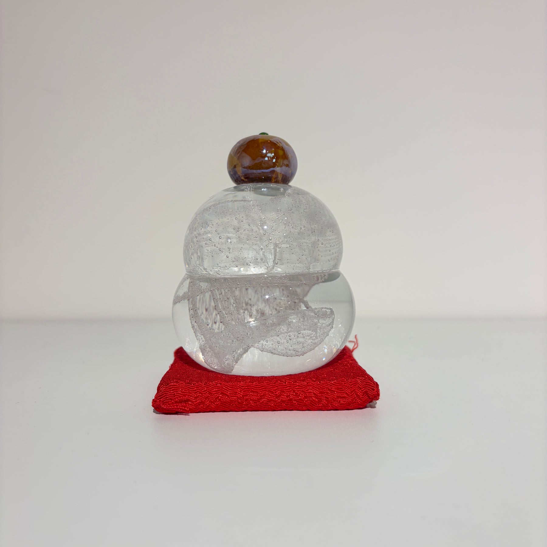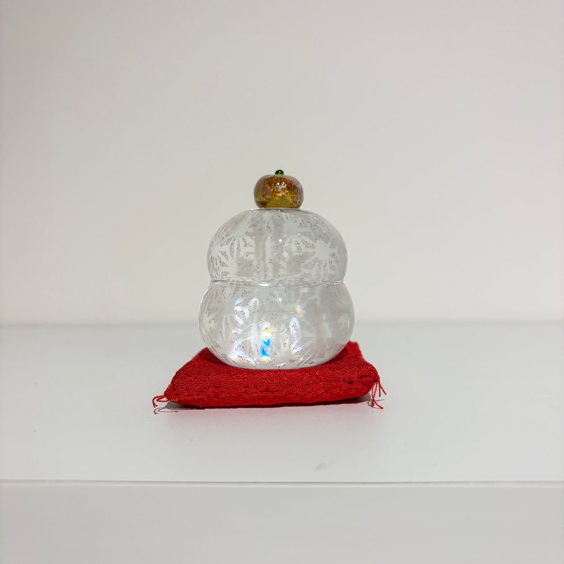 熱したがガラスの塊に重曹を入れることで発泡をさせ、泡を装飾とした作品の他、麻の葉や市松模様をガラスに施した鏡餅も制作されています。