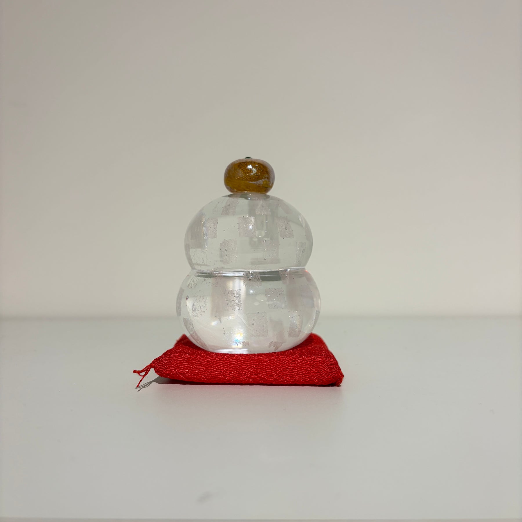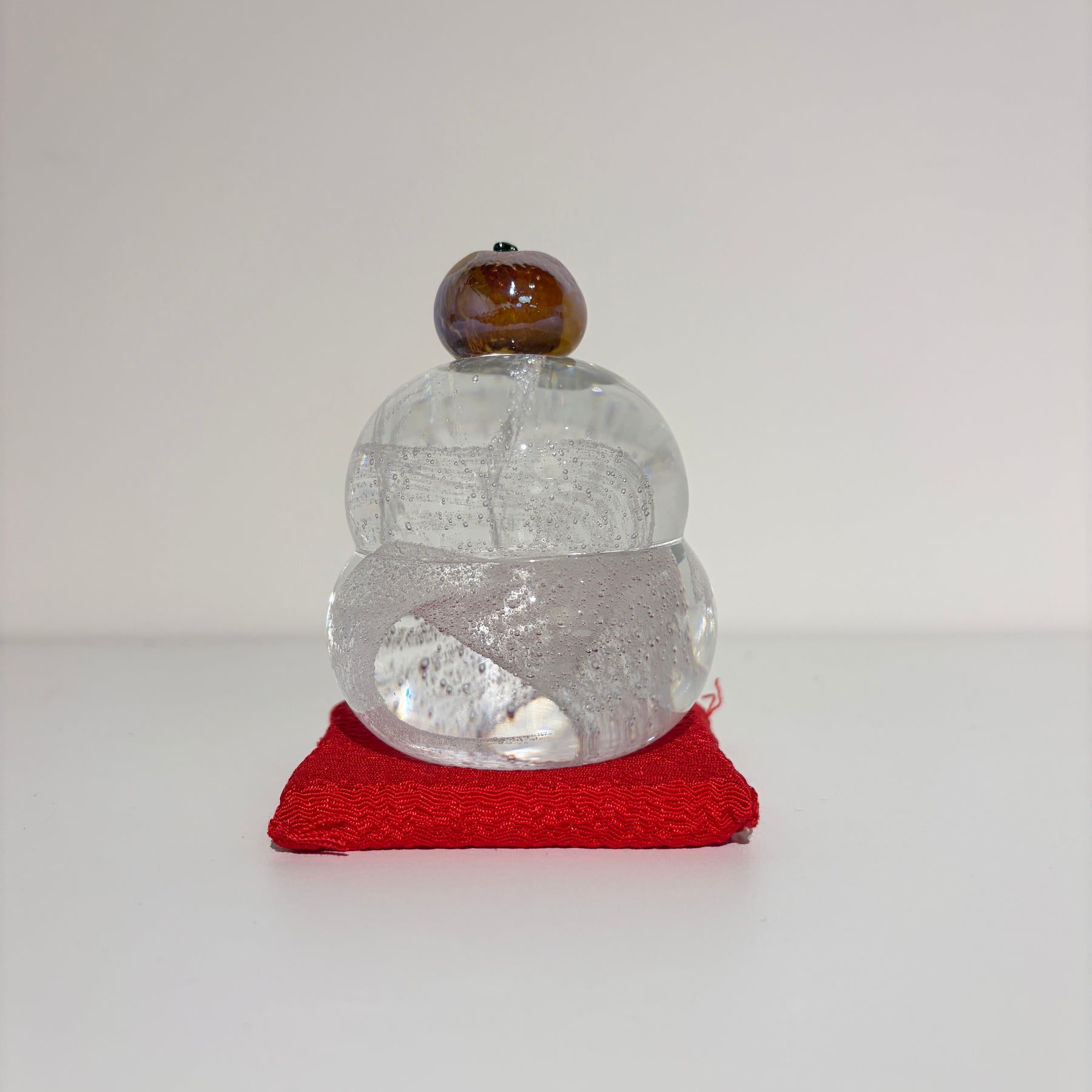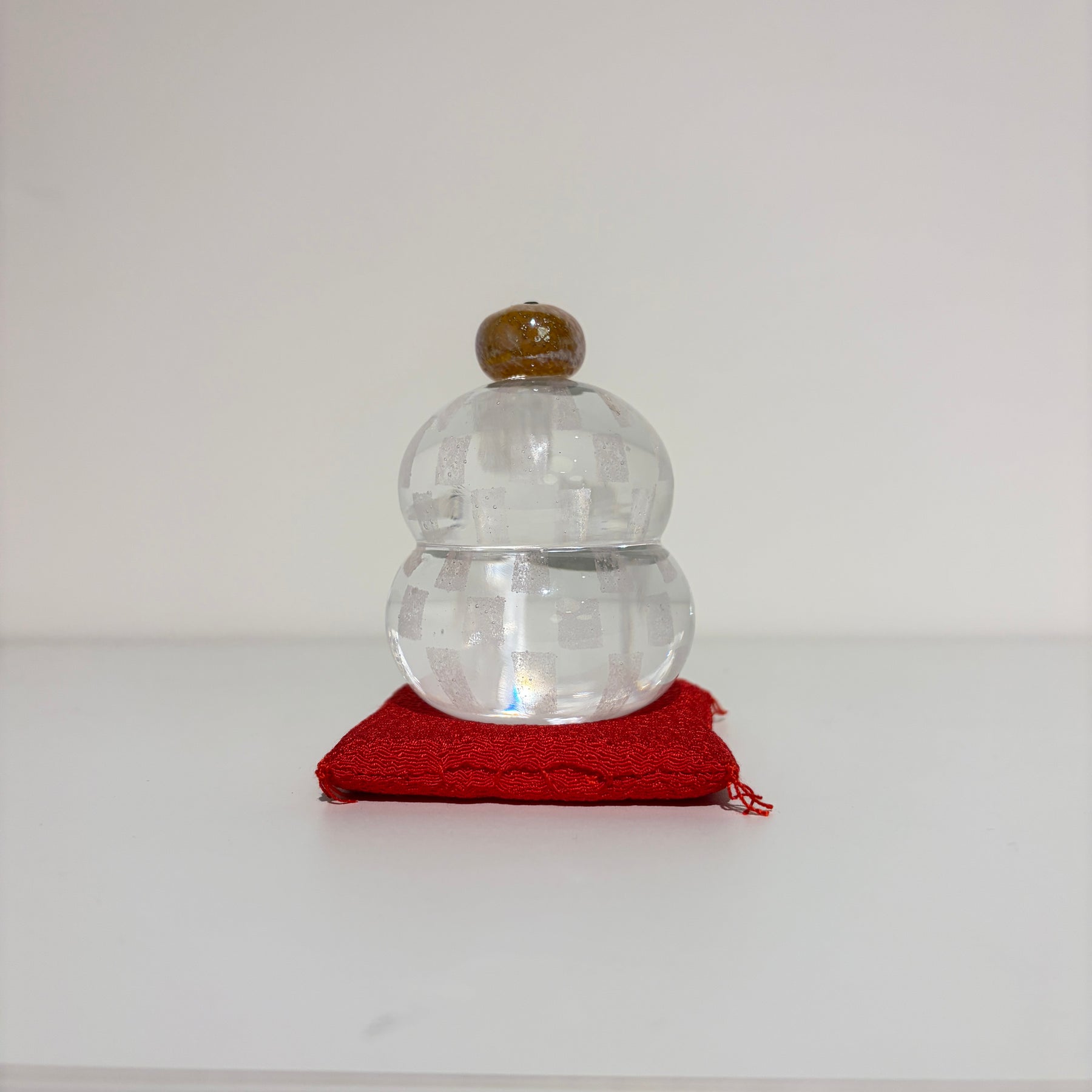 熱したがガラスの塊に重曹を入れることで発泡をさせ、泡を装飾とした作品の他、麻の葉や市松模様をガラスに施した鏡餅も制作されています。