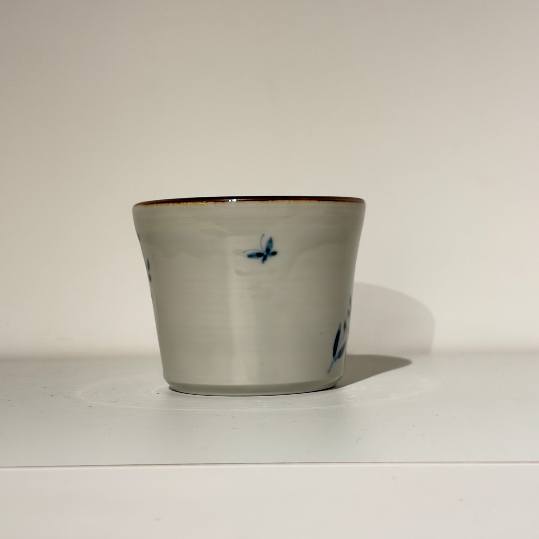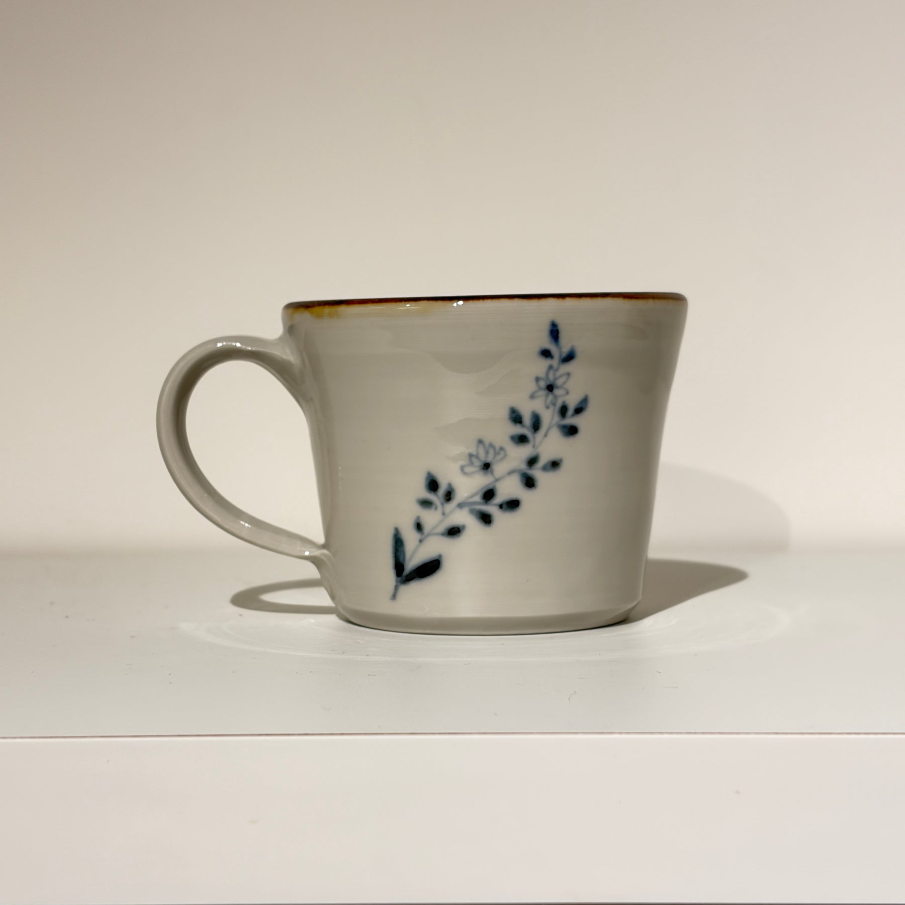 だみ花文とは、絵付けの技法を指し、筆で絵の具をぼかしながら濃淡をつける表現のことです。輪郭線をはっきり描かず、にじみやグラデーションによって立体感や柔らかさを出すことで、花びらの重なりや奥行きが、自然に表現される上品なマグです。
